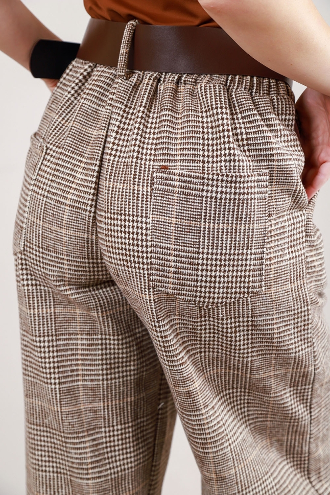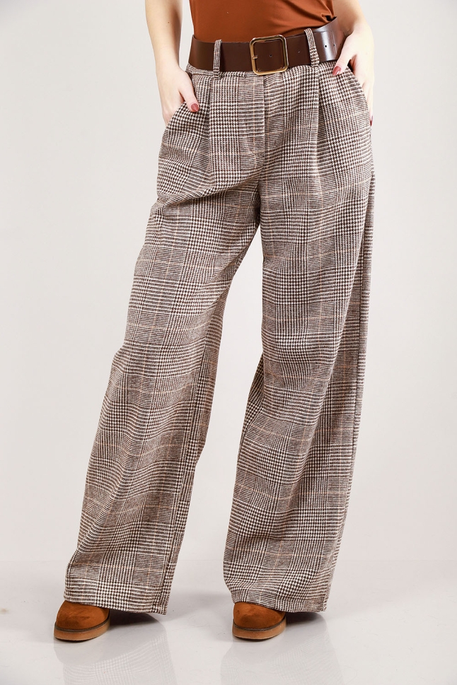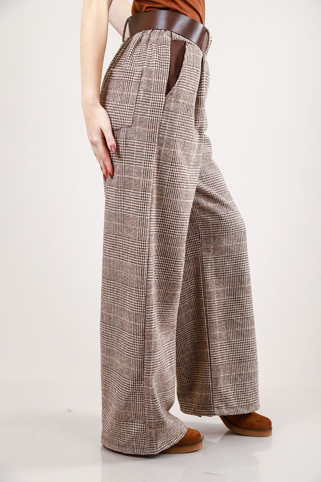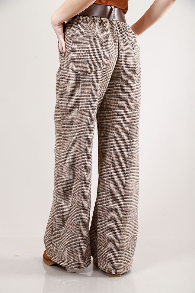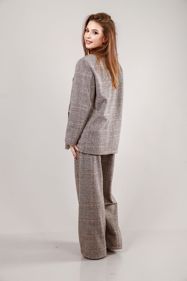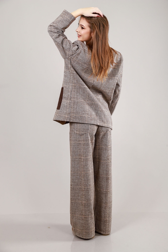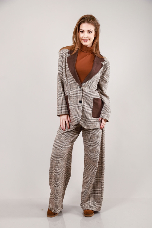 Елегантен комплект от две части – сако и широк панталон в каре с кожени детайли