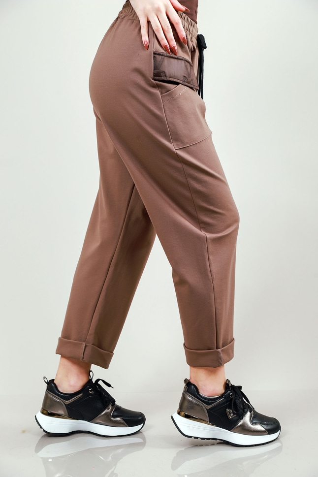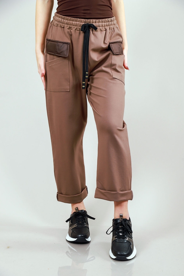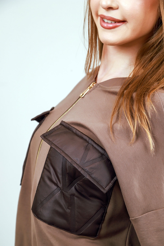 Модерен дамски комплект, който съчетава спортна визия с елегантен акцент. Изработен е от мека и удобна материя в дълбок кафяв цвят, а контрастните кожени елементи придават луксозен и актуален вид.