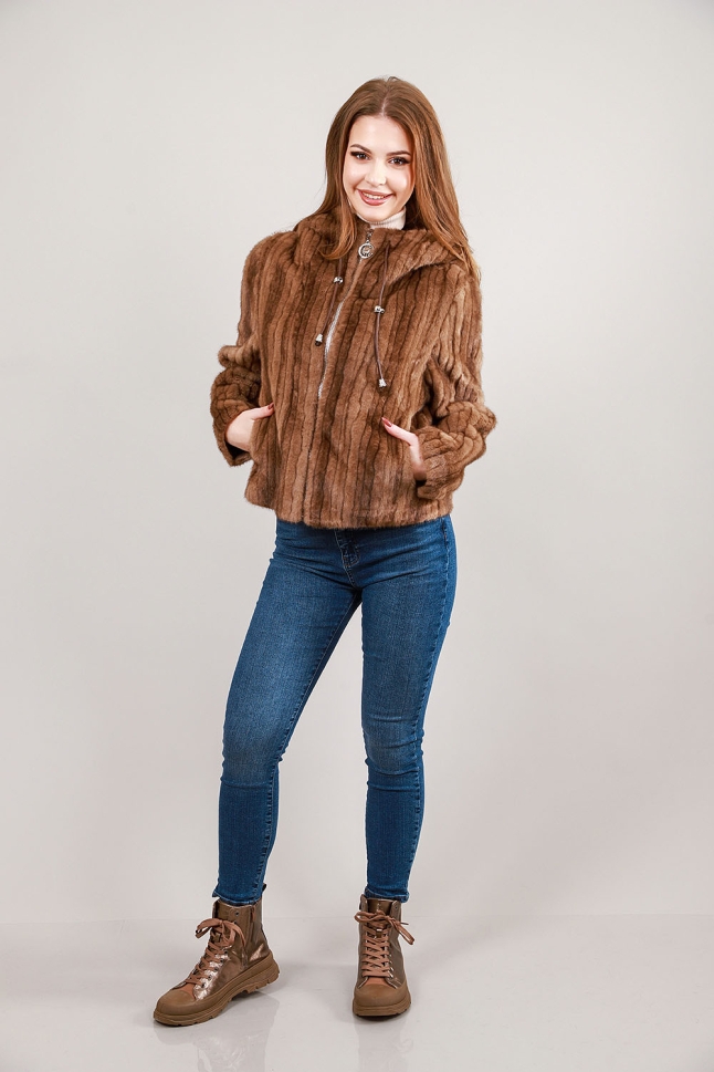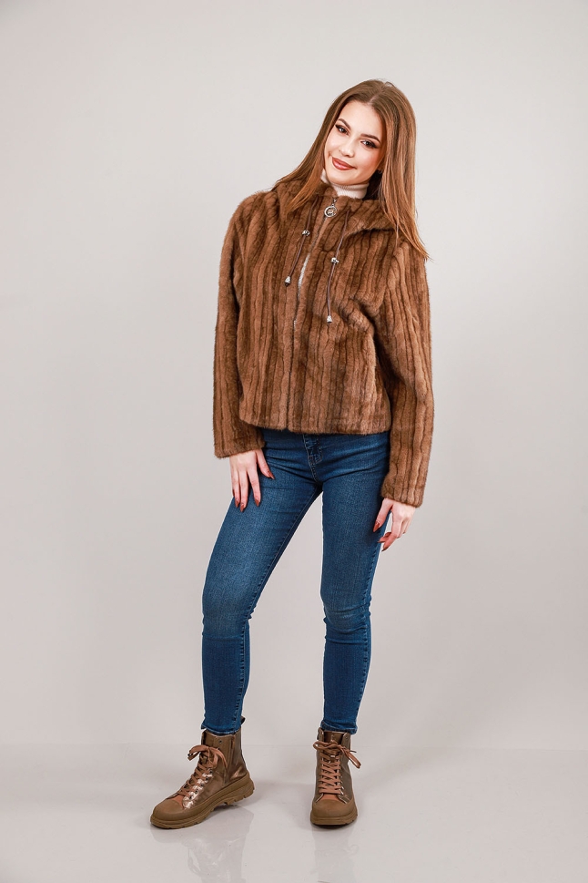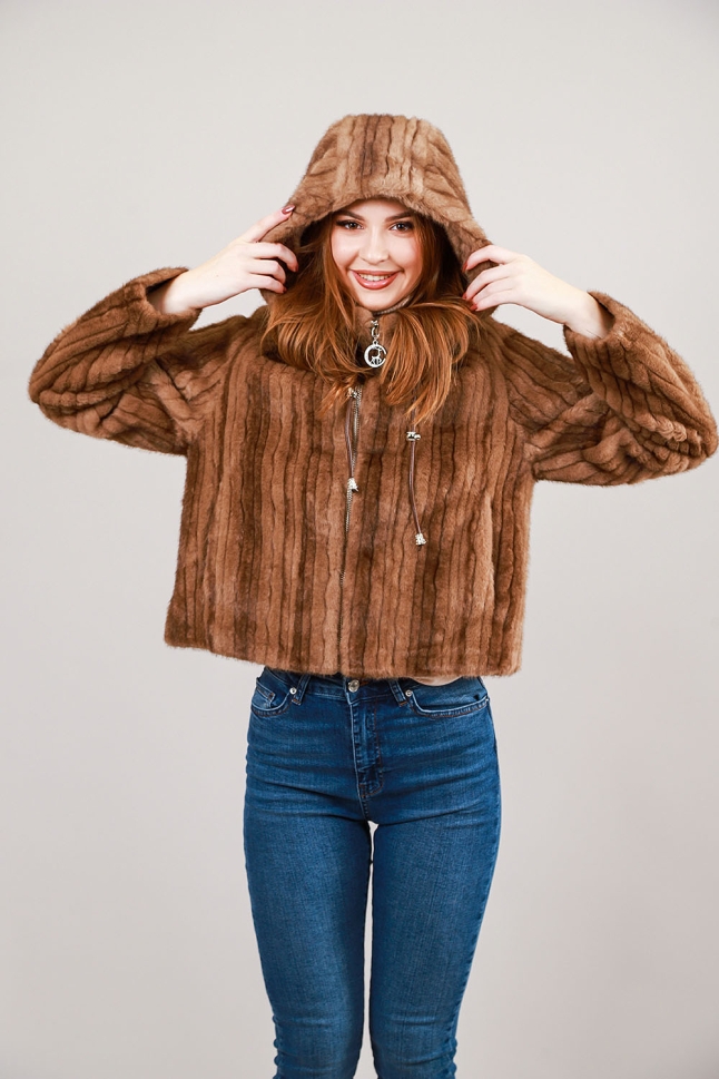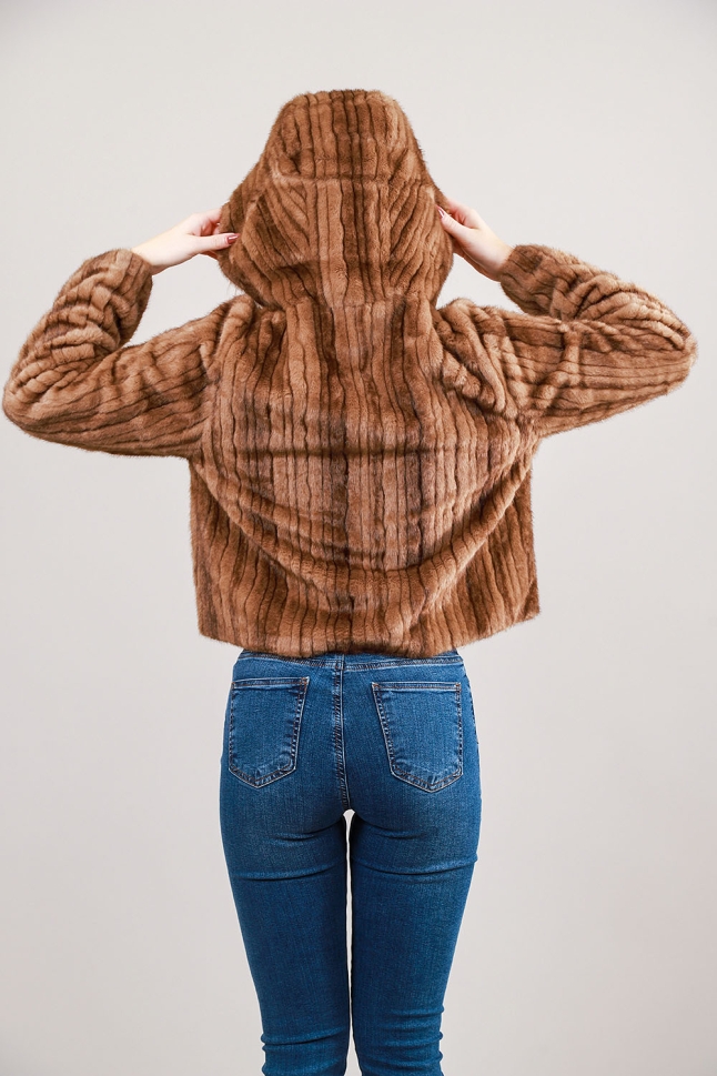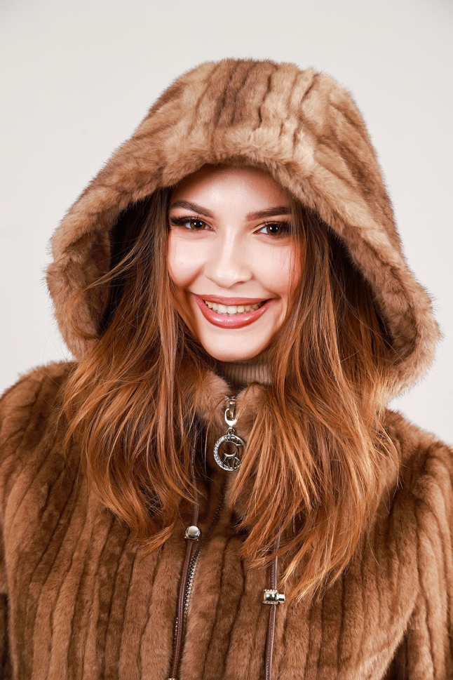 Елегантно палто тип яке от ефектен еко косъм в кафяво със светли ивици. Свободен силует с предно закопчаване посредством метален цип и яка. Предни джобове и качулка отзад с регулиращи връзки. Моделът е подплатен.