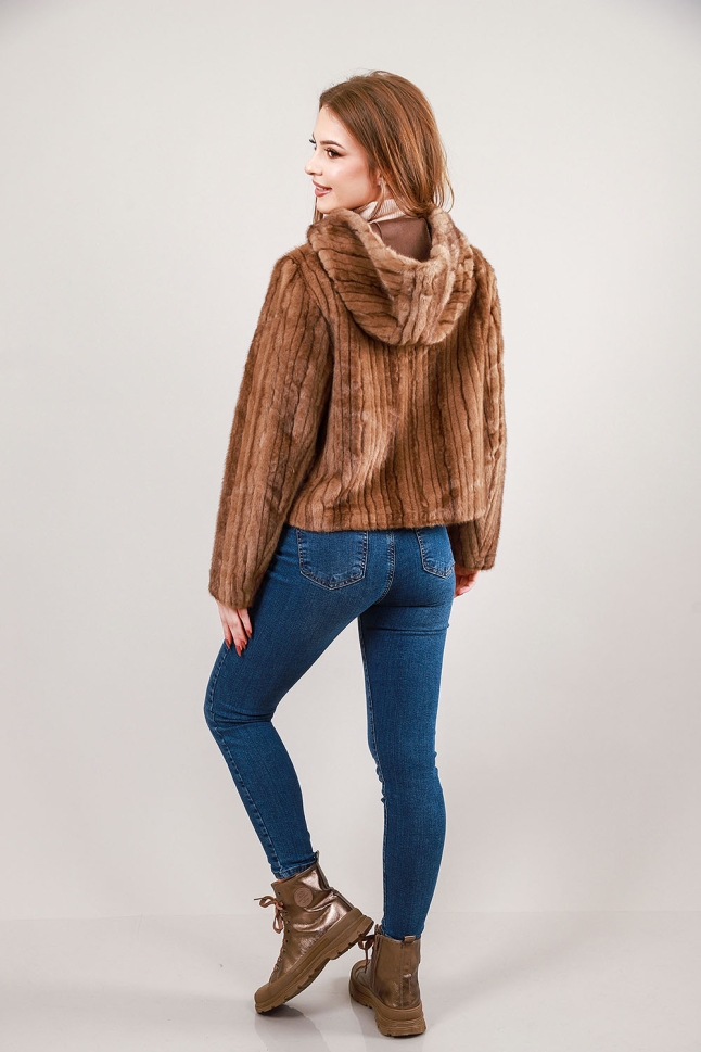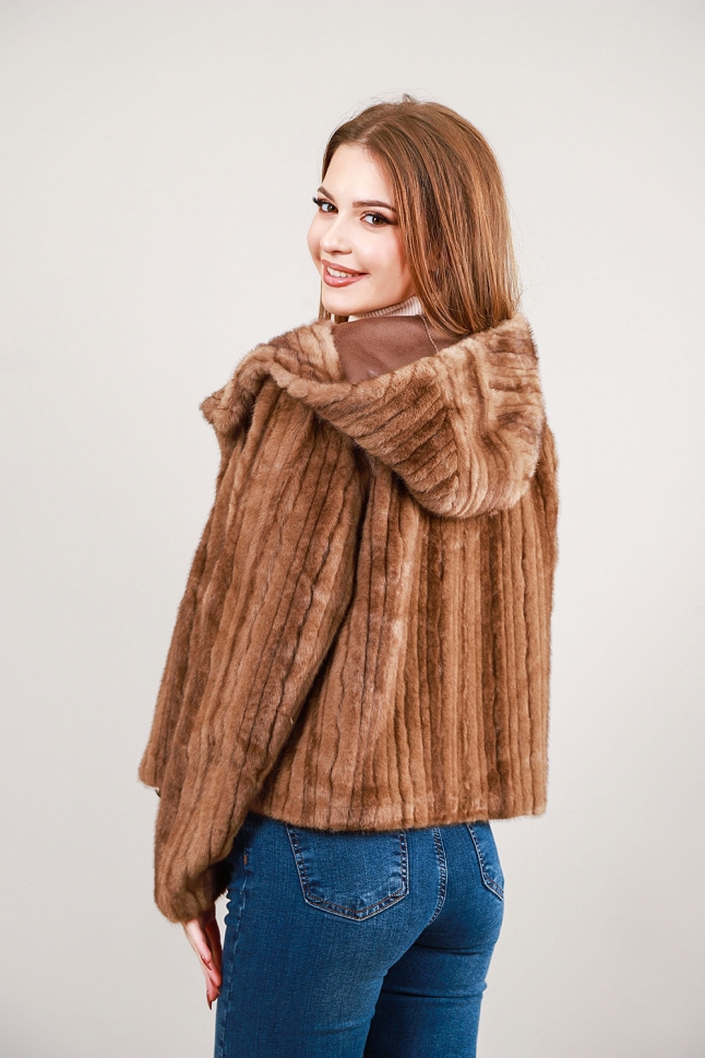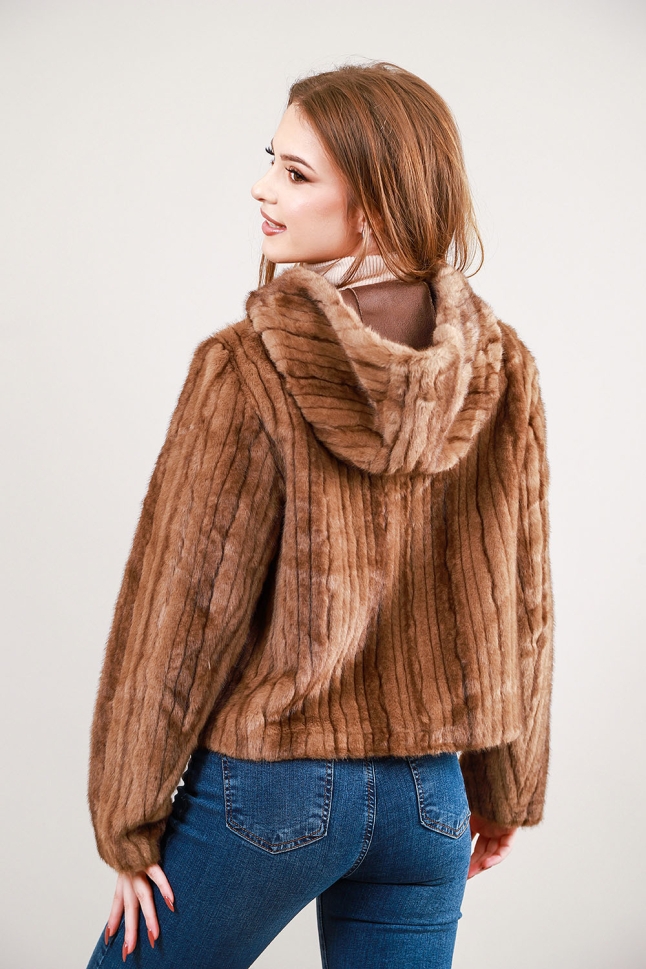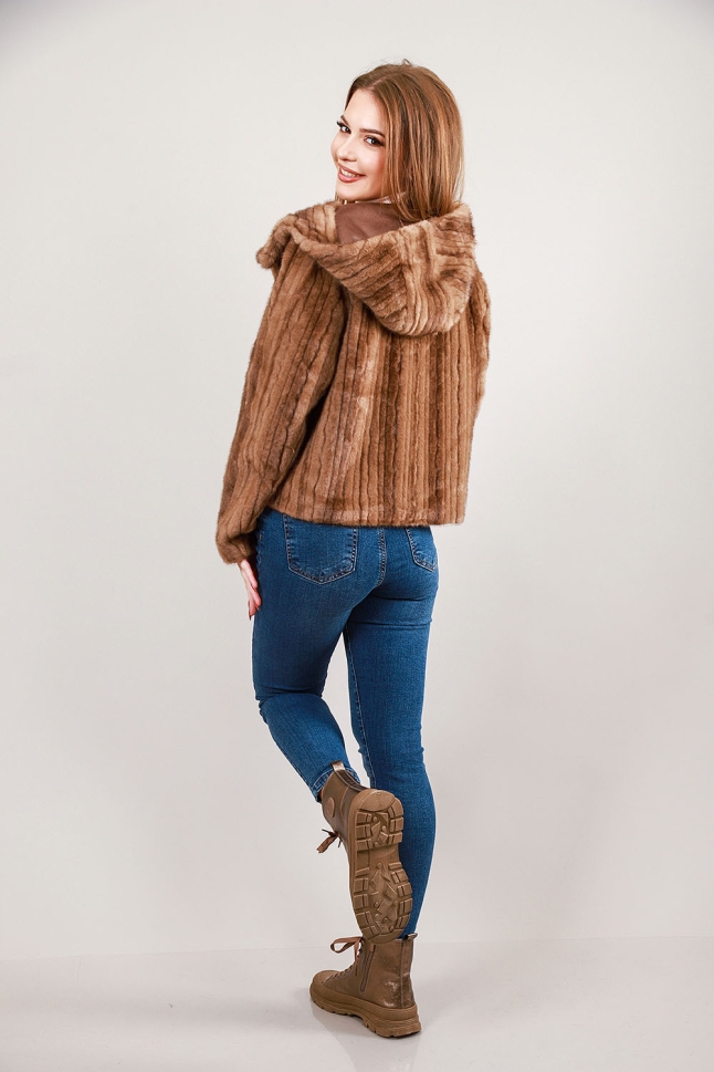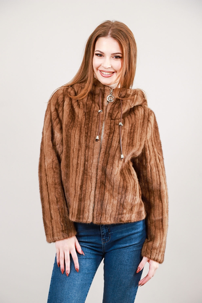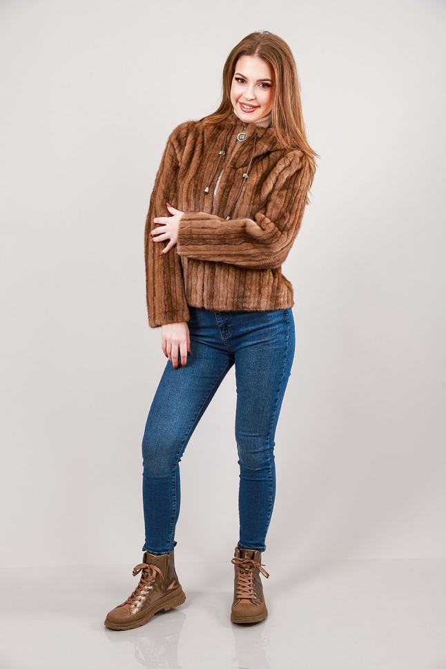 Елегантно палто тип яке от ефектен еко косъм в кафяво със светли ивици. Свободен силует с предно закопчаване посредством метален цип и яка. Предни джобове и качулка отзад с регулиращи връзки. Моделът е подплатен.